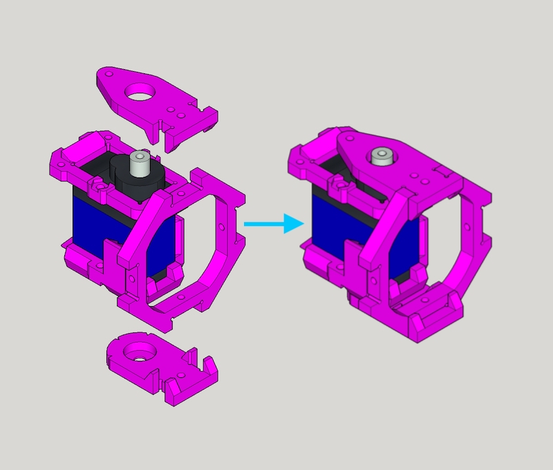 • Step 1 - Combine thigh_top, MG92B and thigh_bottom, use M2x30mm screw and nut to secure them together.