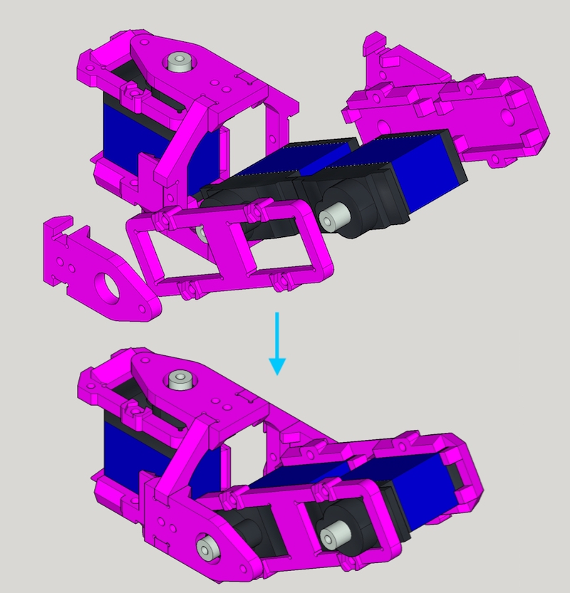 • Step 1 - Combine thigh_top, MG92B and thigh_bottom, use M2x30mm screw and nut to secure them together.